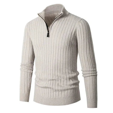 Featuring a structured vertical ribbed texture and a high collar with a sleek zip closure, this sweater blends warmth, style, and versatility for everyday wear. Perfect for layering or wearing solo, it’s a go-to piece for both casual and refined looks.